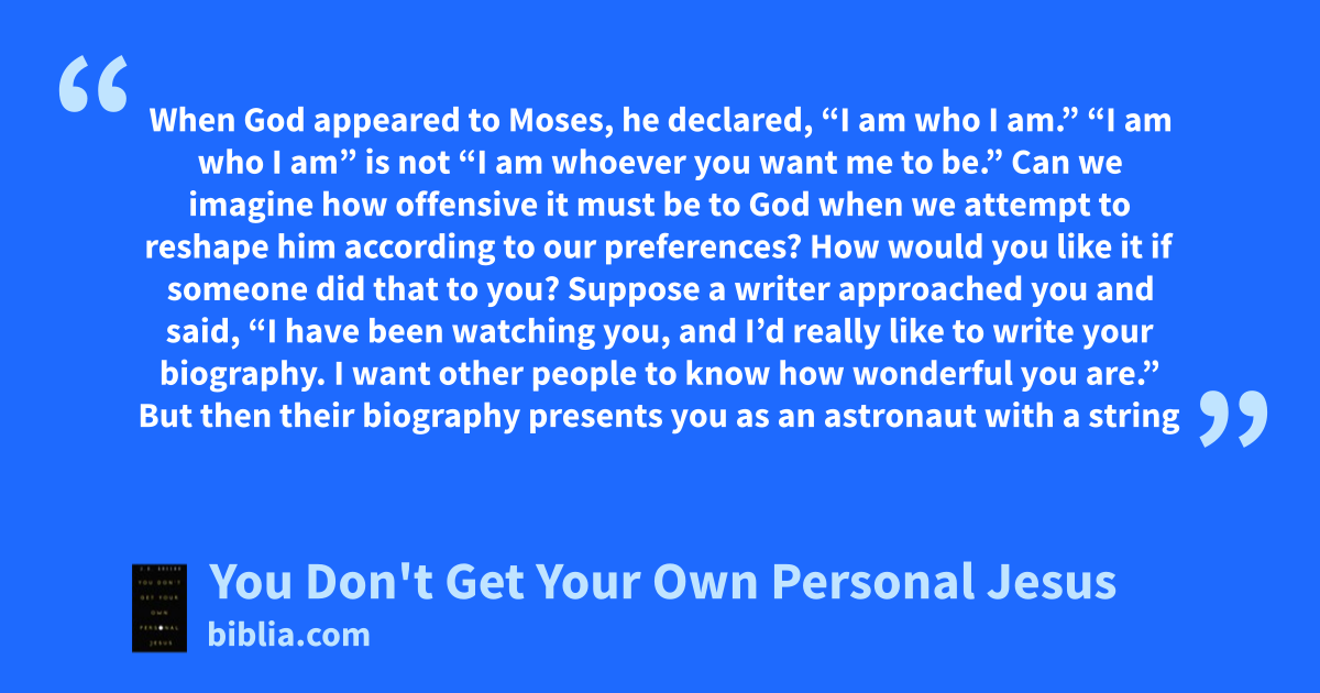 When God appeared to Moses, he declared, “I am who I am.” “I am who I am” is not “I am whoever you want me to be.” Can we imagine how offensive it must be to God when we attempt to reshape him according to our preferences? How would you like it if someone did that to you? Suppose a writer approached you and said, “I have been watching you, and I’d really like to write your biography. I want other people to know how wonderful you are.” But then their biography presents you as an astronaut with a string