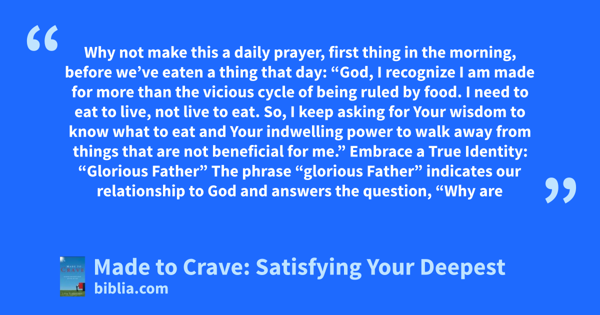 Why not make this a daily prayer, first thing in the morning, before we’ve eaten a thing that day: “God, I recognize I am made for more than the vicious cycle of being ruled by food. I need to eat to live, not live to eat. So, I keep asking for Your wisdom to know what to eat and Your indwelling power to walk away from things that are not beneficial for me.” Embrace a True Identity: “Glorious Father” The phrase “glorious Father” indicates our relationship to God and answers the question, “Why are