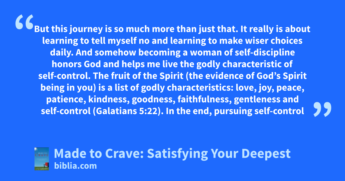 But this journey is so much more than just that. It really is about learning to tell myself no and learning to make wiser choices daily. And somehow becoming a woman of self-discipline honors God and helps me live the godly characteristic of self-control. The fruit of the Spirit (the evidence of God’s Spirit being in you) is a list of godly characteristics: love, joy, peace, patience, kindness, goodness, faithfulness, gentleness and self-control (Galatians 5:22). In the end, pursuing self-control