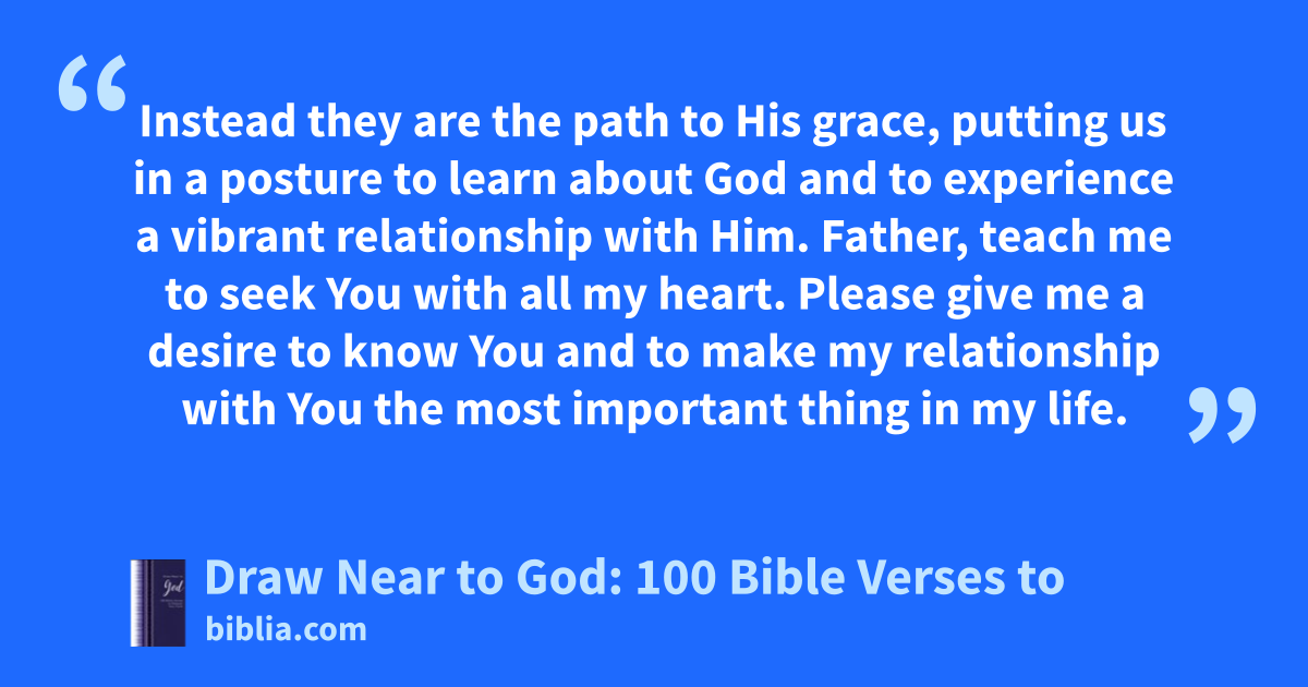 Instead they are the path to His grace, putting us in a posture to learn about God and to experience a vibrant relationship with Him. Father, teach me to seek You with all my heart. Please give me a desire to know You and to make my relationship with You the most important thing in my life.