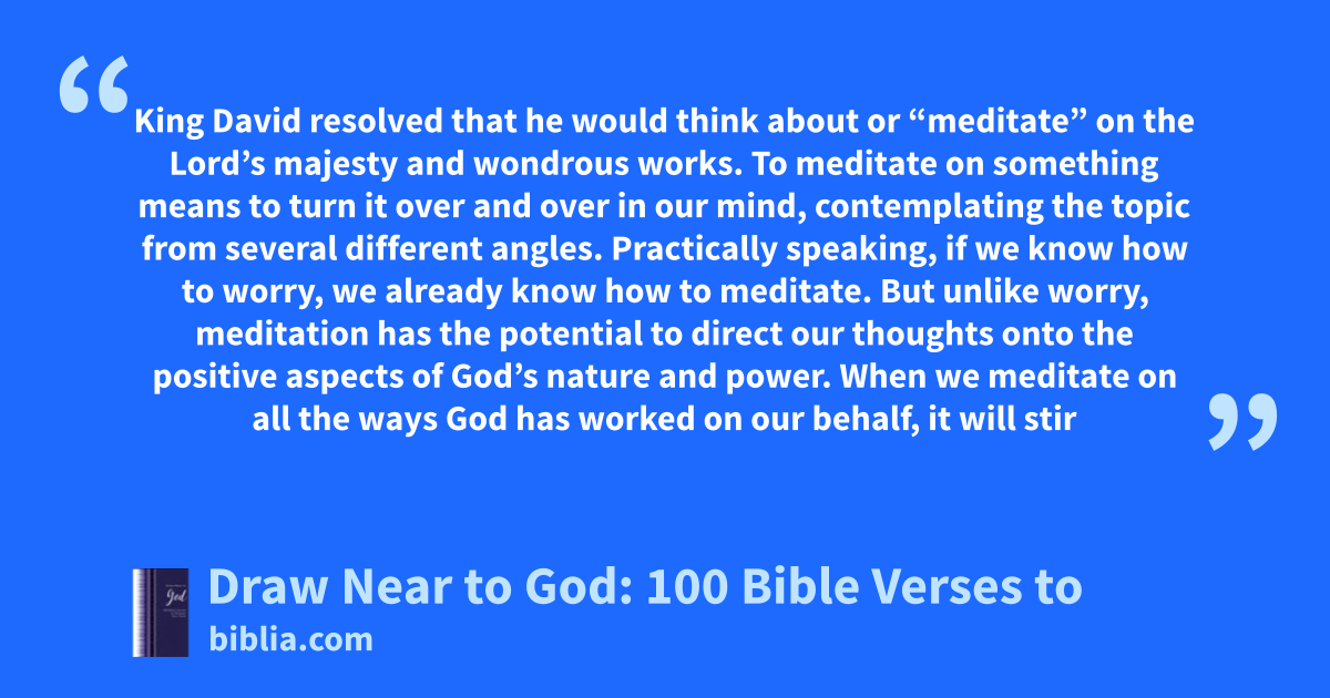 King David resolved that he would think about or “meditate” on the Lord’s majesty and wondrous works. To meditate on something means to turn it over and over in our mind, contemplating the topic from several different angles. Practically speaking, if we know how to worry, we already know how to meditate. But unlike worry, meditation has the potential to direct our thoughts onto the positive aspects of God’s nature and power. When we meditate on all the ways God has worked on our behalf, it will stir