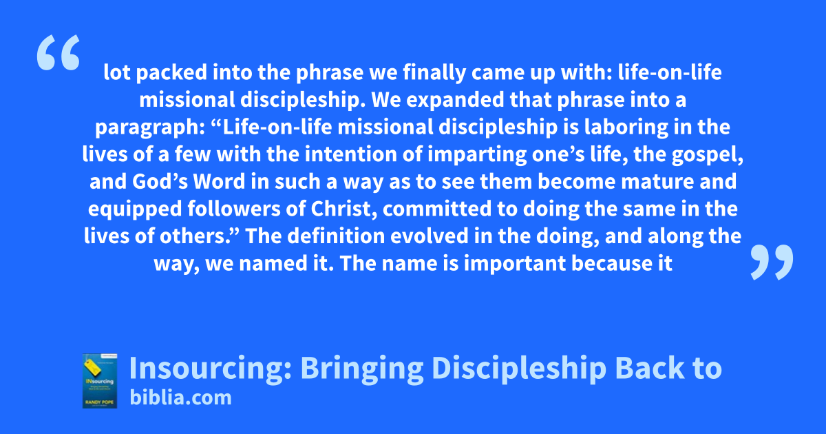 lot packed into the phrase we finally came up with: life-on-life missional discipleship. We expanded that phrase into a paragraph: “Life-on-life missional discipleship is laboring in the lives of a few with the intention of imparting one’s life, the gospel, and God’s Word in such a way as to see them become mature and equipped followers of Christ, committed to doing the same in the lives of others.” The definition evolved in the doing, and along the way, we named it. The name is important because it