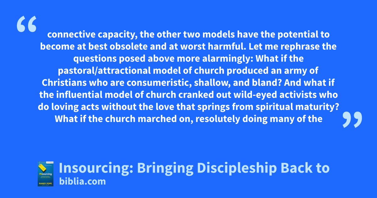 connective capacity, the other two models have the potential to become at best obsolete and at worst harmful. Let me rephrase the questions posed above more alarmingly: What if the pastoral/attractional model of church produced an army of Christians who are consumeristic, shallow, and bland? And what if the influential model of church cranked out wild-eyed activists who do loving acts without the love that springs from spiritual maturity? What if the church marched on, resolutely doing many of the