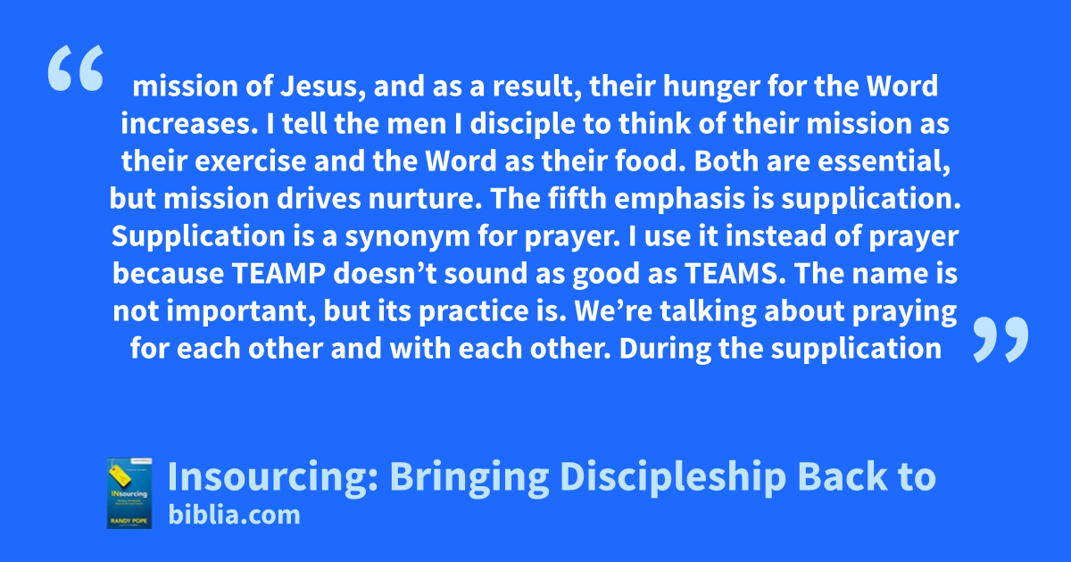 mission of Jesus, and as a result, their hunger for the Word increases. I tell the men I disciple to think of their mission as their exercise and the Word as their food. Both are essential, but mission drives nurture. The fifth emphasis is supplication. Supplication is a synonym for prayer. I use it instead of prayer because TEAMP doesn’t sound as good as TEAMS. The name is not important, but its practice is. We’re talking about praying for each other and with each other. During the supplication
