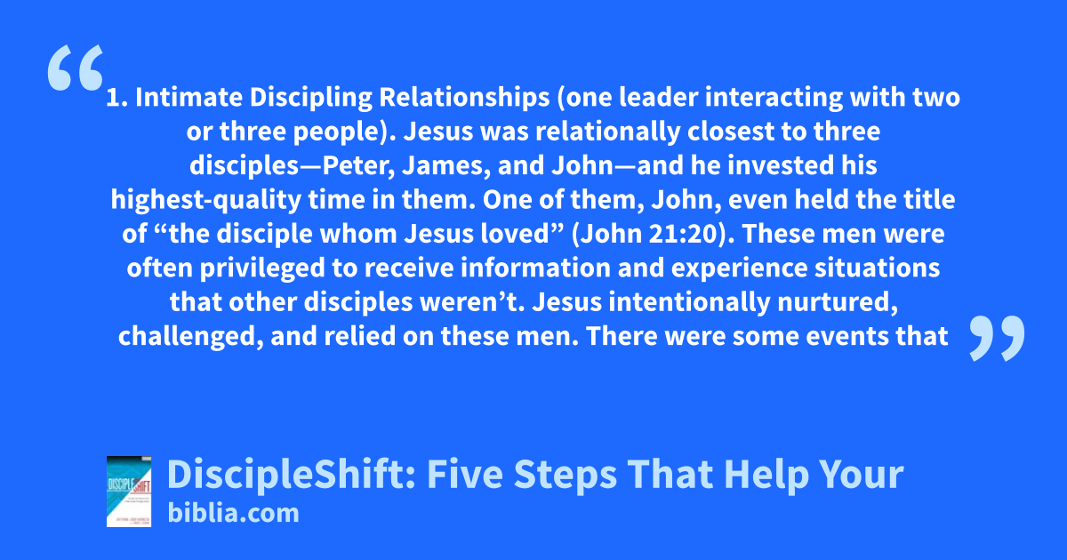 1. Intimate Discipling Relationships (one leader interacting with two or three people). Jesus was relationally closest to three disciples—Peter, James, and John—and he invested his highest-quality time in them. One of them, John, even held the title of “the disciple whom Jesus loved” (John 21:20). These men were often privileged to receive information and experience situations that other disciples weren’t. Jesus intentionally nurtured, challenged, and relied on these men. There were some events that