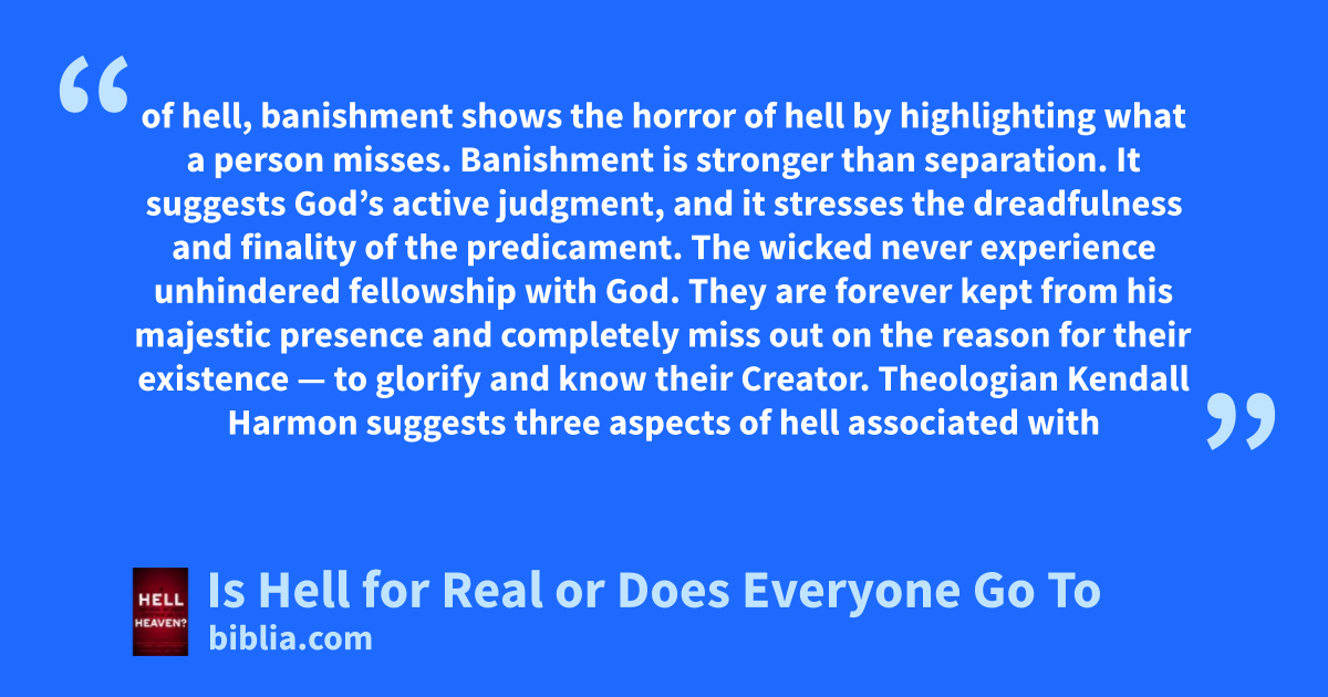 of hell, banishment shows the horror of hell by highlighting what a person misses. Banishment is stronger than separation. It suggests God’s active judgment, and it stresses the dreadfulness and finality of the predicament. The wicked never experience unhindered fellowship with God. They are forever kept from his majestic presence and completely miss out on the reason for their existence — to glorify and know their Creator. Theologian Kendall Harmon suggests three aspects of hell associated with
