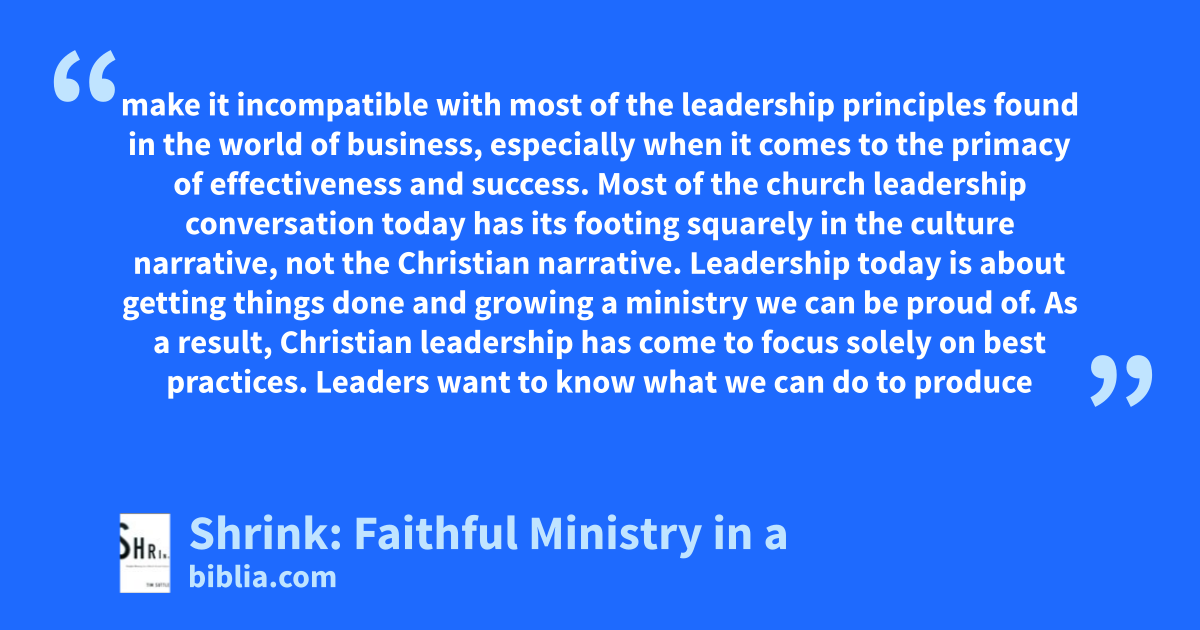 make it incompatible with most of the leadership principles found in the world of business, especially when it comes to the primacy of effectiveness and success. Most of the church leadership conversation today has its footing squarely in the culture narrative, not the Christian narrative. Leadership today is about getting things done and growing a ministry we can be proud of. As a result, Christian leadership has come to focus solely on best practices. Leaders want to know what we can do to produce