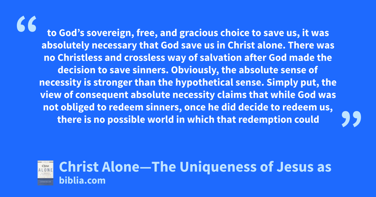 to God’s sovereign, free, and gracious choice to save us, it was absolutely necessary that God save us in Christ alone. There was no Christless and crossless way of salvation after God made the decision to save sinners. Obviously, the absolute sense of necessity is stronger than the hypothetical sense. Simply put, the view of consequent absolute necessity claims that while God was not obliged to redeem sinners, once he did decide to redeem us, there is no possible world in which that redemption could