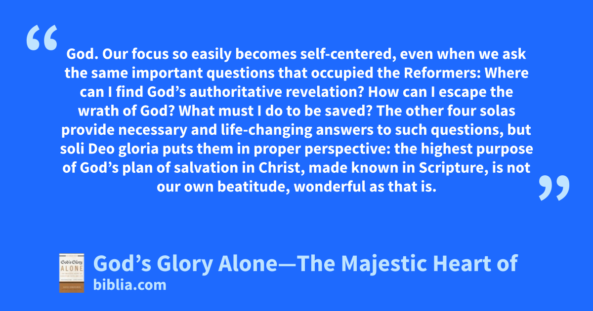 God. Our focus so easily becomes self-centered, even when we ask the same important questions that occupied the Reformers: Where can I find God’s authoritative revelation? How can I escape the wrath of God? What must I do to be saved? The other four solas provide necessary and life-changing answers to such questions, but soli Deo gloria puts them in proper perspective: the highest purpose of God’s plan of salvation in Christ, made known in Scripture, is not our own beatitude, wonderful as that is.