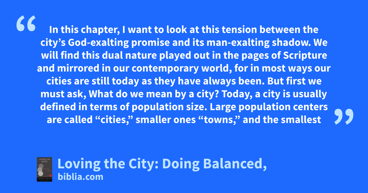 In this chapter, I want to look at this tension between the city’s God-exalting promise and its man-exalting shadow. We will find this dual nature played out in the pages of Scripture and mirrored in our contemporary world, for in most ways our cities are still today as they have always been. But first we must ask, What do we mean by a city? Today, a city is usually defined in terms of population size. Large population centers are called “cities,” smaller ones “towns,” and the smallest