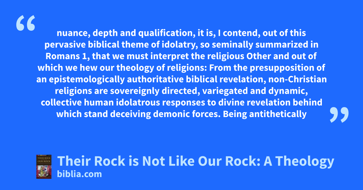 nuance, depth and qualification, it is, I contend, out of this pervasive biblical theme of idolatry, so seminally summarized in Romans 1, that we must interpret the religious Other and out of which we hew our theology of religions: From the presupposition of an epistemologically authoritative biblical revelation, non-Christian religions are sovereignly directed, variegated and dynamic, collective human idolatrous responses to divine revelation behind which stand deceiving demonic forces. Being antithetically