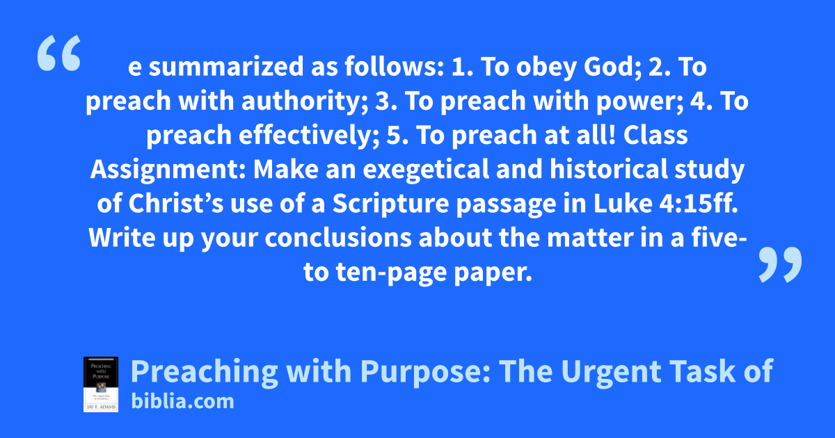 e summarized as follows: 1. To obey God; 2. To preach with authority; 3. To preach with power; 4. To preach effectively; 5. To preach at all! Class Assignment: Make an exegetical and historical study of Christ’s use of a Scripture passage in Luke 4:15ff. Write up your conclusions about the matter in a five- to ten-page paper.
