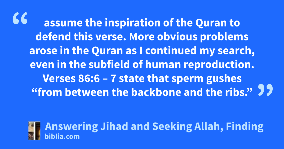 assume the inspiration of the Quran to defend this verse. More obvious problems arose in the Quran as I continued my search, even in the subfield of human reproduction. Verses 86:6 – 7 state that sperm gushes “from between the backbone and the ribs.”