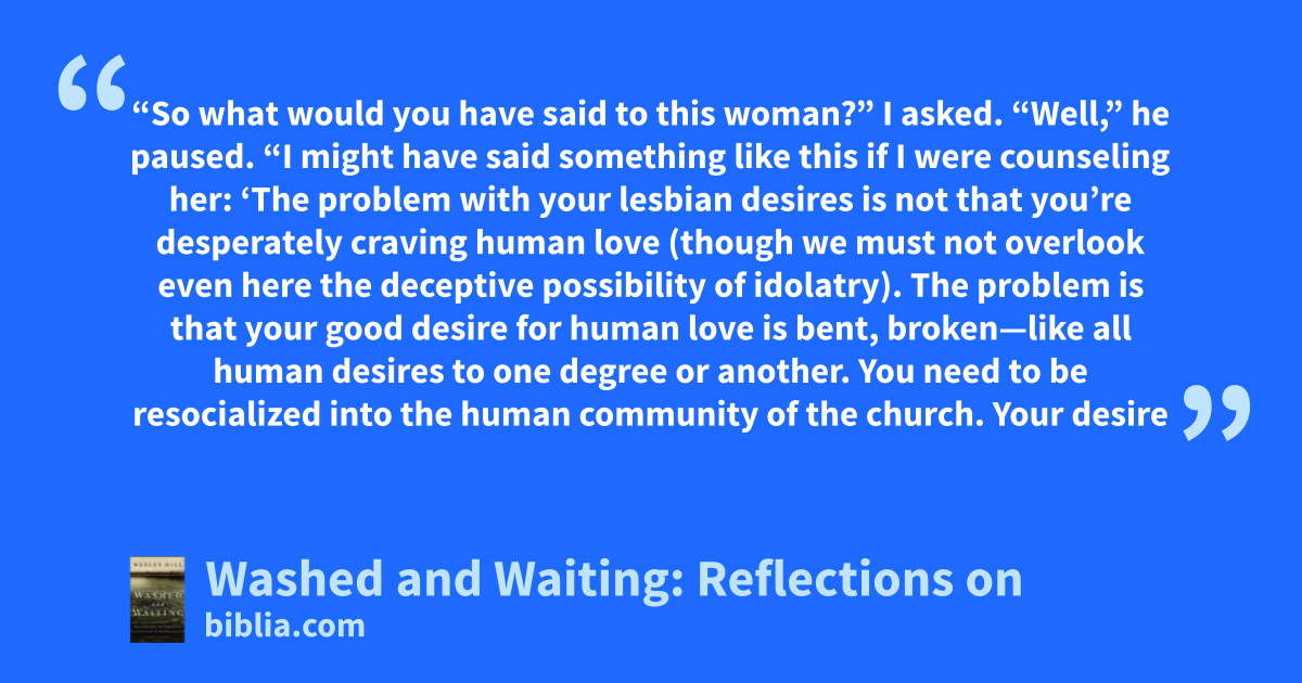 “So what would you have said to this woman?” I asked. “Well,” he paused. “I might have said something like this if I were counseling her: ‘The problem with your lesbian desires is not that you’re desperately craving human love (though we must not overlook even here the deceptive possibility of idolatry). The problem is that your good desire for human love is bent, broken—like all human desires to one degree or another. You need to be resocialized into the human community of the church. Your desire