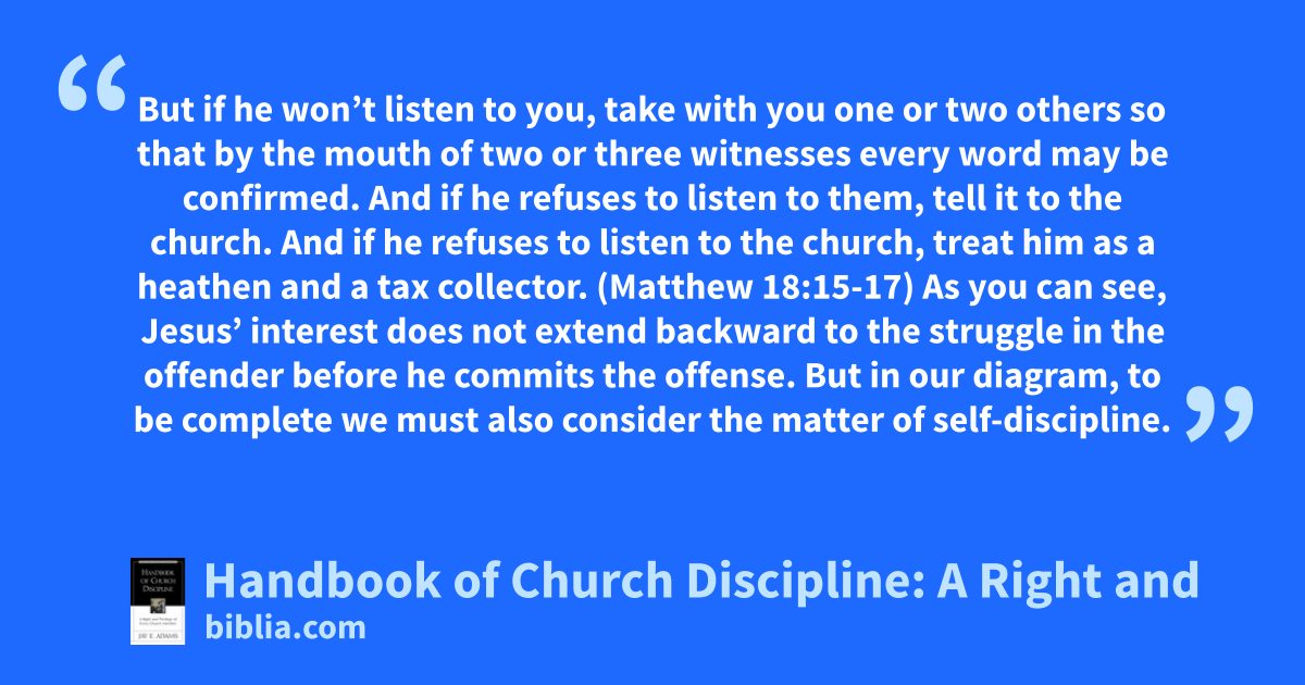 But if he won’t listen to you, take with you one or two others so that by the mouth of two or three witnesses every word may be confirmed. And if he refuses to listen to them, tell it to the church. And if he refuses to listen to the church, treat him as a heathen and a tax collector. (Matthew 18:15-17) As you can see, Jesus’ interest does not extend backward to the struggle in the offender before he commits the offense. But in our diagram, to be complete we must also consider the matter of self-discipline.