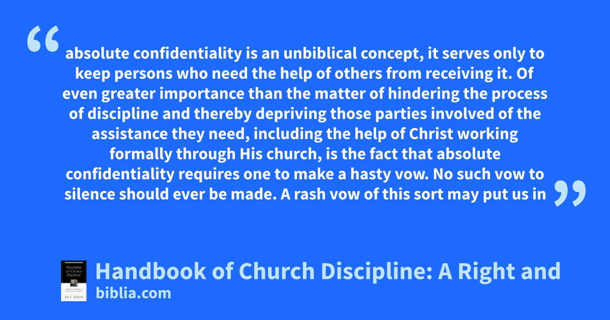 absolute confidentiality is an unbiblical concept, it serves only to keep persons who need the help of others from receiving it. Of even greater importance than the matter of hindering the process of discipline and thereby depriving those parties involved of the assistance they need, including the help of Christ working formally through His church, is the fact that absolute confidentiality requires one to make a hasty vow. No such vow to silence should ever be made. A rash vow of this sort may put us in