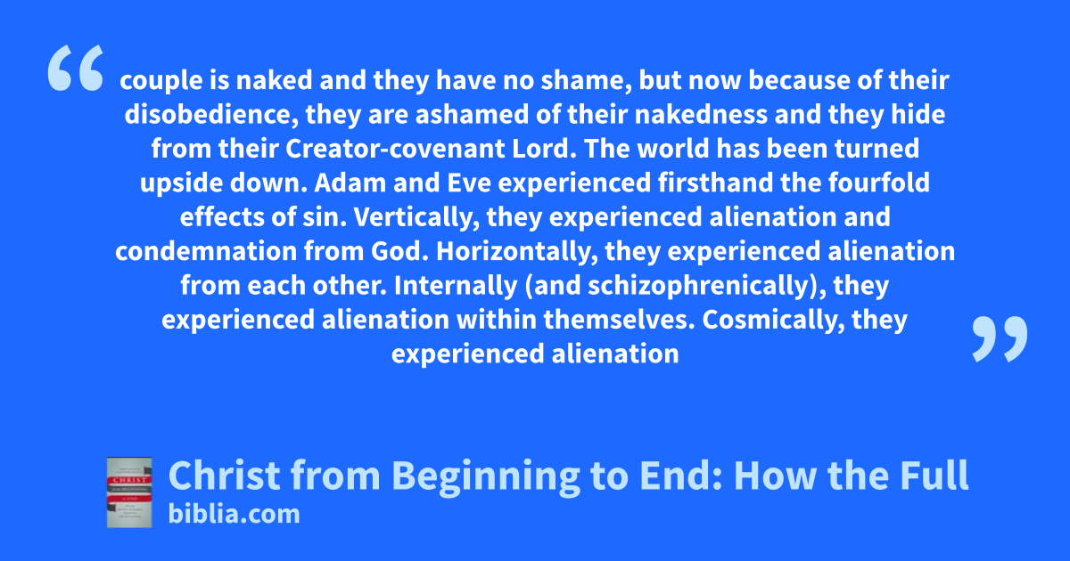 couple is naked and they have no shame, but now because of their disobedience, they are ashamed of their nakedness and they hide from their Creator-covenant Lord. The world has been turned upside down. Adam and Eve experienced firsthand the fourfold effects of sin. Vertically, they experienced alienation and condemnation from God. Horizontally, they experienced alienation from each other. Internally (and schizophrenically), they experienced alienation within themselves. Cosmically, they experienced alienation