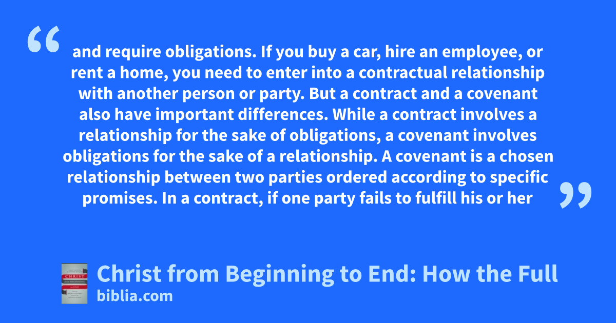 and require obligations. If you buy a car, hire an employee, or rent a home, you need to enter into a contractual relationship with another person or party. But a contract and a covenant also have important differences. While a contract involves a relationship for the sake of obligations, a covenant involves obligations for the sake of a relationship. A covenant is a chosen relationship between two parties ordered according to specific promises. In a contract, if one party fails to fulfill his or her