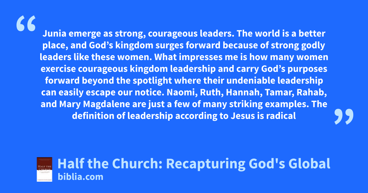 Junia emerge as strong, courageous leaders. The world is a better place, and God’s kingdom surges forward because of strong godly leaders like these women. What impresses me is how many women exercise courageous kingdom leadership and carry God’s purposes forward beyond the spotlight where their undeniable leadership can easily escape our notice. Naomi, Ruth, Hannah, Tamar, Rahab, and Mary Magdalene are just a few of many striking examples. The definition of leadership according to Jesus is radical