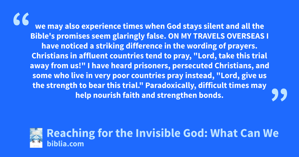 we may also experience times when God stays silent and all the Bible's promises seem glaringly false. ON MY TRAVELS OVERSEAS I have noticed a striking difference in the wording of prayers. Christians in affluent countries tend to pray, "Lord, take this trial away from us!" I have heard prisoners, persecuted Christians, and some who live in very poor countries pray instead, "Lord, give us the strength to bear this trial." Paradoxically, difficult times may help nourish faith and strengthen bonds.