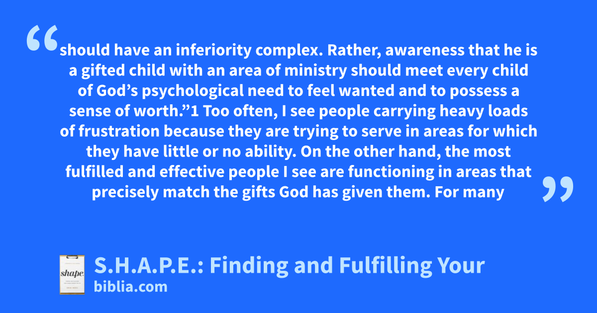 should have an inferiority complex. Rather, awareness that he is a gifted child with an area of ministry should meet every child of God’s psychological need to feel wanted and to possess a sense of worth.”1 Too often, I see people carrying heavy loads of frustration because they are trying to serve in areas for which they have little or no ability. On the other hand, the most fulfilled and effective people I see are functioning in areas that precisely match the gifts God has given them. For many