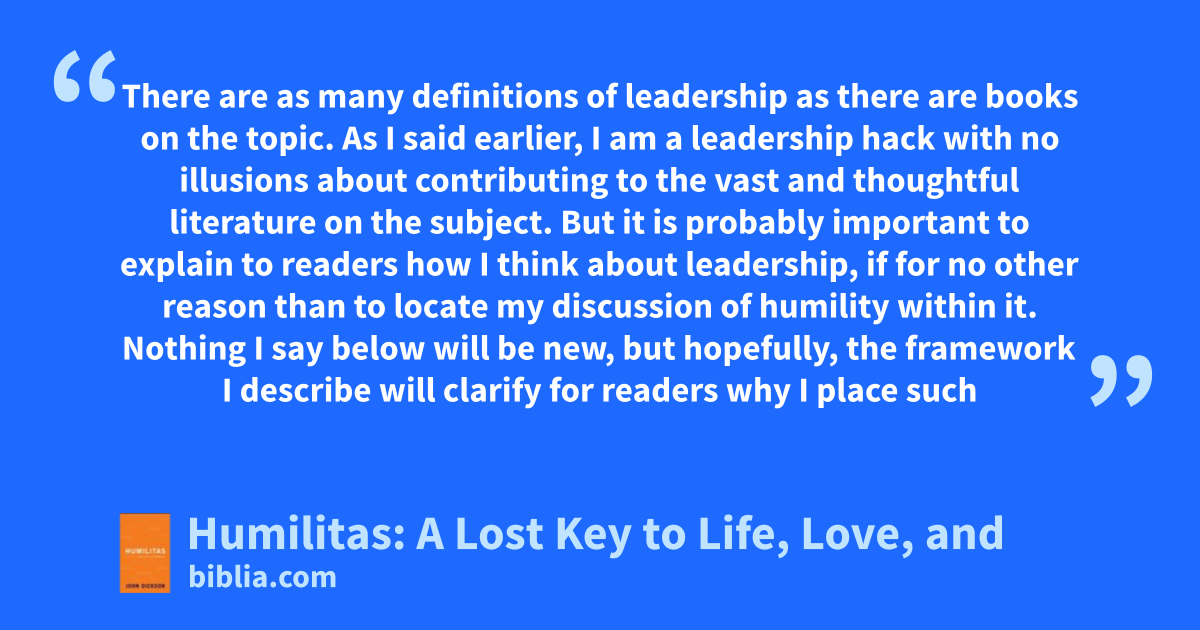 There are as many definitions of leadership as there are books on the topic. As I said earlier, I am a leadership hack with no illusions about contributing to the vast and thoughtful literature on the subject. But it is probably important to explain to readers how I think about leadership, if for no other reason than to locate my discussion of humility within it. Nothing I say below will be new, but hopefully, the framework I describe will clarify for readers why I place such