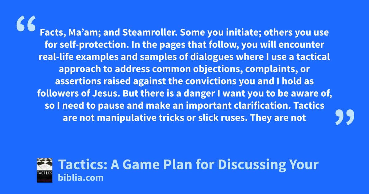Facts, Ma’am; and Steamroller. Some you initiate; others you use for self-protection. In the pages that follow, you will encounter real-life examples and samples of dialogues where I use a tactical approach to address common objections, complaints, or assertions raised against the convictions you and I hold as followers of Jesus. But there is a danger I want you to be aware of, so I need to pause and make an important clarification. Tactics are not manipulative tricks or slick ruses. They are not