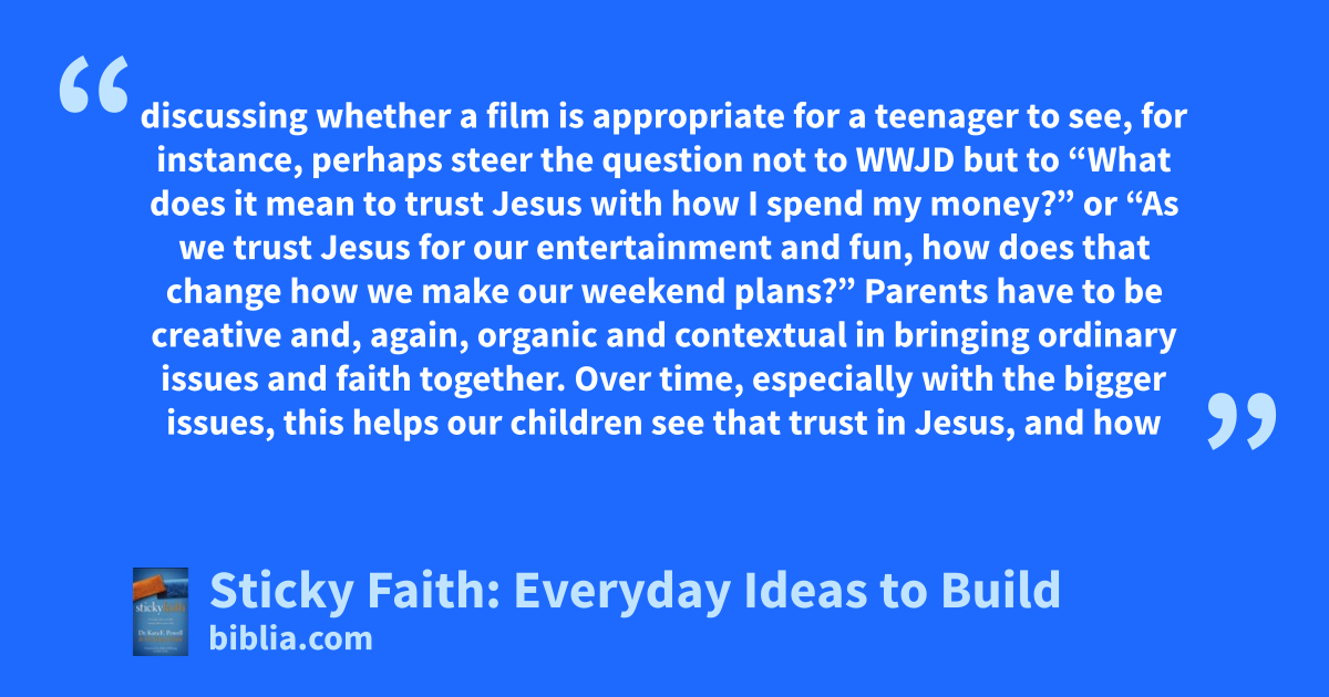discussing whether a film is appropriate for a teenager to see, for instance, perhaps steer the question not to WWJD but to “What does it mean to trust Jesus with how I spend my money?” or “As we trust Jesus for our entertainment and fun, how does that change how we make our weekend plans?” Parents have to be creative and, again, organic and contextual in bringing ordinary issues and faith together. Over time, especially with the bigger issues, this helps our children see that trust in Jesus, and how