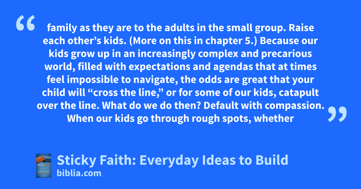 family as they are to the adults in the small group. Raise each other’s kids. (More on this in chapter 5.) Because our kids grow up in an increasingly complex and precarious world, filled with expectations and agendas that at times feel impossible to navigate, the odds are great that your child will “cross the line,” or for some of our kids, catapult over the line. What do we do then? Default with compassion. When our kids go through rough spots, whether