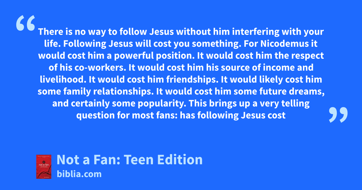 There is no way to follow Jesus without him interfering with your life. Following Jesus will cost you something. For Nicodemus it would cost him a powerful position. It would cost him the respect of his co-workers. It would cost him his source of income and livelihood. It would cost him friendships. It would likely cost him some family relationships. It would cost him some future dreams, and certainly some popularity. This brings up a very telling question for most fans: has following Jesus cost