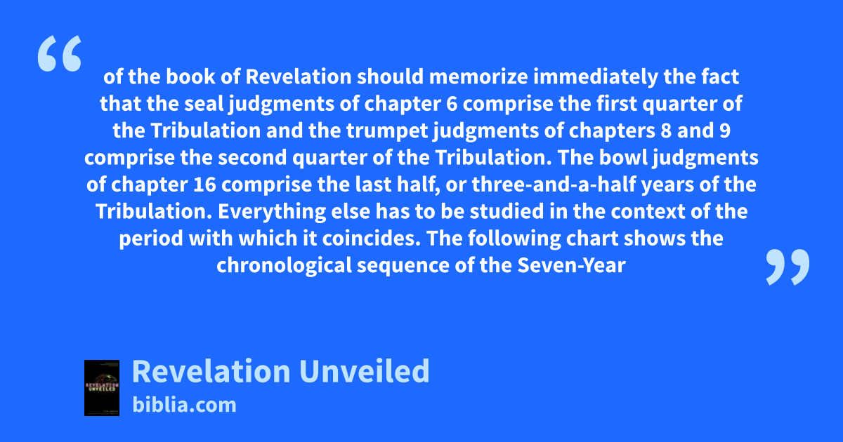 of the book of Revelation should memorize immediately the fact that the seal judgments of chapter 6 comprise the first quarter of the Tribulation and the trumpet judgments of chapters 8 and 9 comprise the second quarter of the Tribulation. The bowl judgments of chapter 16 comprise the last half, or three-and-a-half years of the Tribulation. Everything else has to be studied in the context of the period with which it coincides. The following chart shows the chronological sequence of the Seven-Year