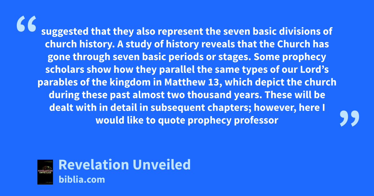 suggested that they also represent the seven basic divisions of church history. A study of history reveals that the Church has gone through seven basic periods or stages. Some prophecy scholars show how they parallel the same types of our Lord’s parables of the kingdom in Matthew 13, which depict the church during these past almost two thousand years. These will be dealt with in detail in subsequent chapters; however, here I would like to quote prophecy professor