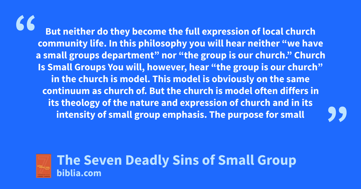But neither do they become the full expression of local church community life. In this philosophy you will hear neither “we have a small groups department” nor “the group is our church.” Church Is Small Groups You will, however, hear “the group is our church” in the church is model. This model is obviously on the same continuum as church of. But the church is model often differs in its theology of the nature and expression of church and in its intensity of small group emphasis. The purpose for small