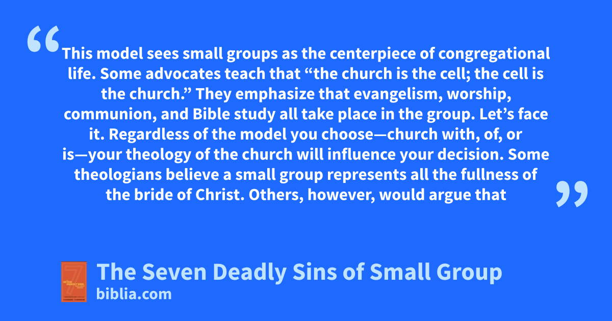 This model sees small groups as the centerpiece of congregational life. Some advocates teach that “the church is the cell; the cell is the church.” They emphasize that evangelism, worship, communion, and Bible study all take place in the group. Let’s face it. Regardless of the model you choose—church with, of, or is—your theology of the church will influence your decision. Some theologians believe a small group represents all the fullness of the bride of Christ. Others, however, would argue that