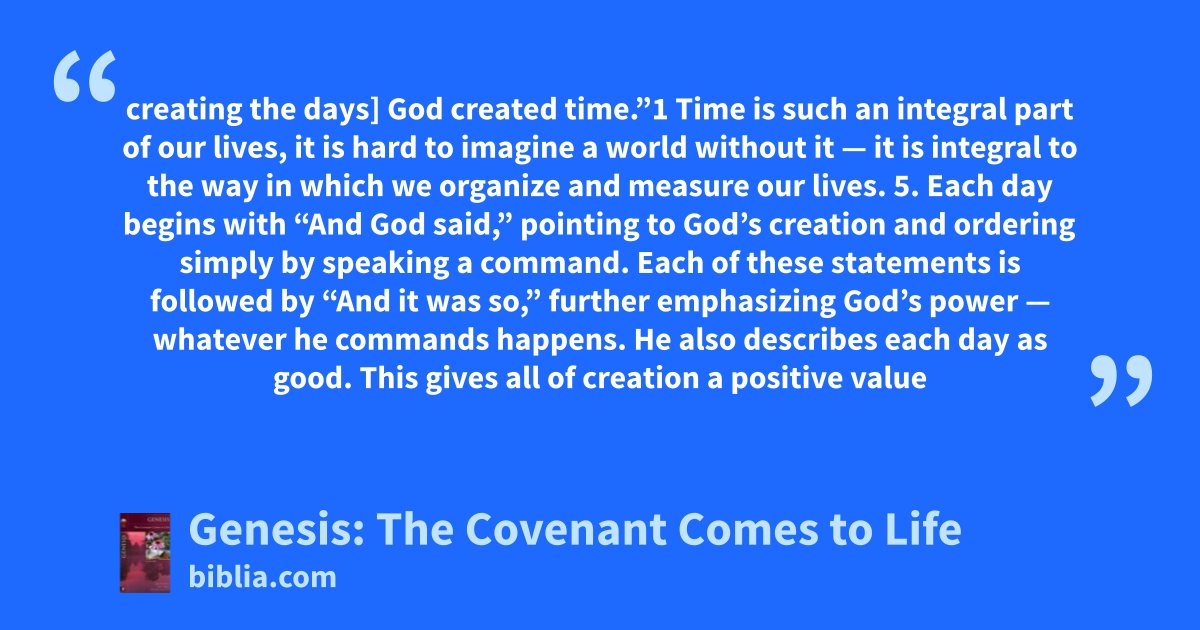 creating the days] God created time.”1 Time is such an integral part of our lives, it is hard to imagine a world without it — it is integral to the way in which we organize and measure our lives. 5. Each day begins with “And God said,” pointing to God’s creation and ordering simply by speaking a command. Each of these statements is followed by “And it was so,” further emphasizing God’s power — whatever he commands happens. He also describes each day as good. This gives all of creation a positive value