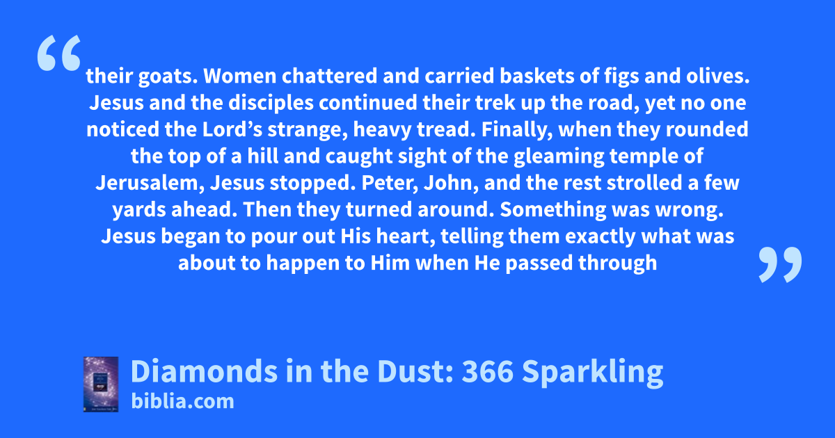 their goats. Women chattered and carried baskets of figs and olives. Jesus and the disciples continued their trek up the road, yet no one noticed the Lord’s strange, heavy tread. Finally, when they rounded the top of a hill and caught sight of the gleaming temple of Jerusalem, Jesus stopped. Peter, John, and the rest strolled a few yards ahead. Then they turned around. Something was wrong. Jesus began to pour out His heart, telling them exactly what was about to happen to Him when He passed through