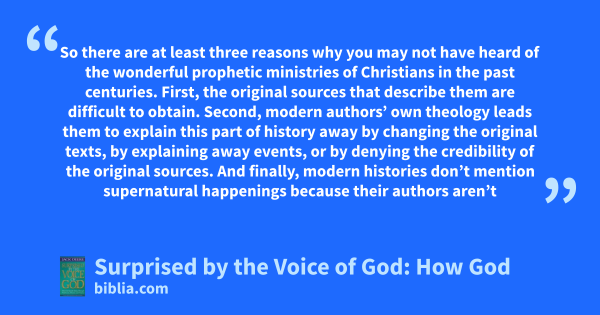 So there are at least three reasons why you may not have heard of the wonderful prophetic ministries of Christians in the past centuries. First, the original sources that describe them are difficult to obtain. Second, modern authors’ own theology leads them to explain this part of history away by changing the original texts, by explaining away events, or by denying the credibility of the original sources. And finally, modern histories don’t mention supernatural happenings because their authors aren’t