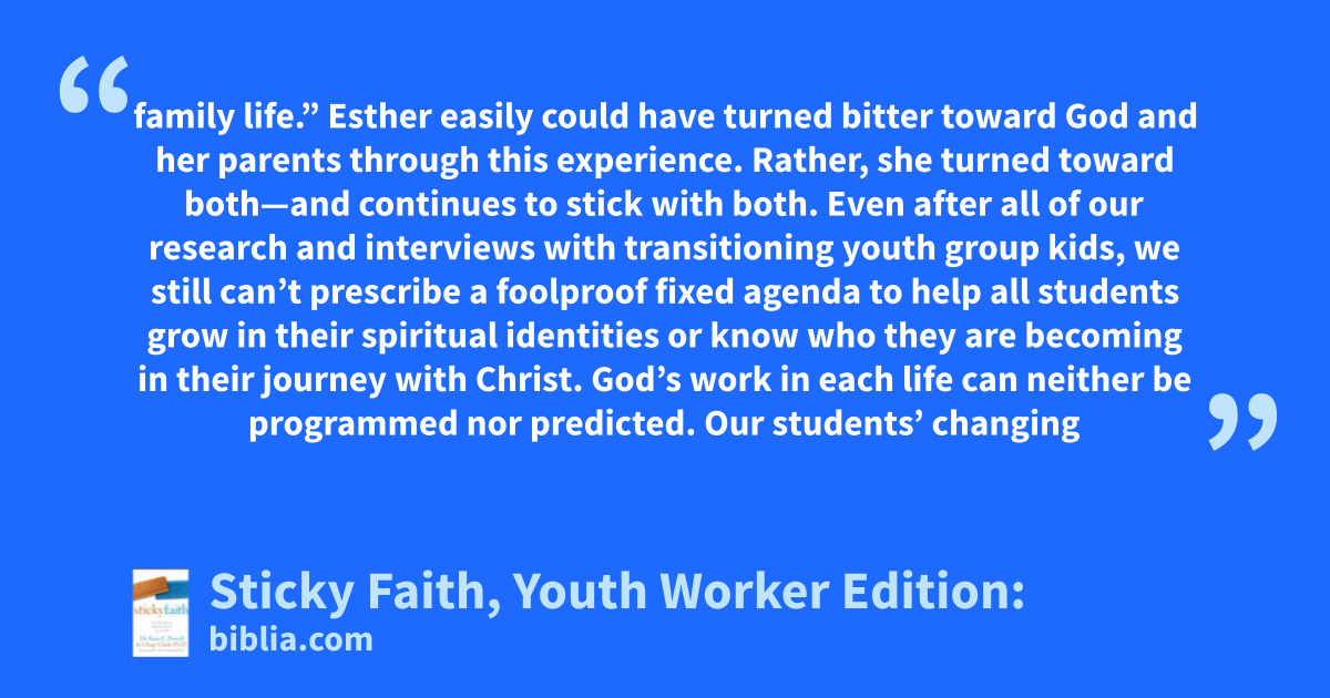 family life.” Esther easily could have turned bitter toward God and her parents through this experience. Rather, she turned toward both—and continues to stick with both. Even after all of our research and interviews with transitioning youth group kids, we still can’t prescribe a foolproof fixed agenda to help all students grow in their spiritual identities or know who they are becoming in their journey with Christ. God’s work in each life can neither be programmed nor predicted. Our students’ changing