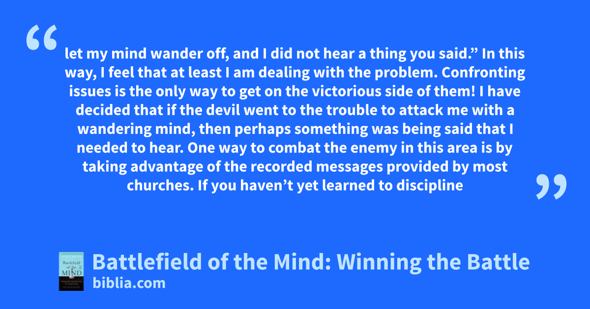 let my mind wander off, and I did not hear a thing you said.” In this way, I feel that at least I am dealing with the problem. Confronting issues is the only way to get on the victorious side of them! I have decided that if the devil went to the trouble to attack me with a wandering mind, then perhaps something was being said that I needed to hear. One way to combat the enemy in this area is by taking advantage of the recorded messages provided by most churches. If you haven’t yet learned to discipline