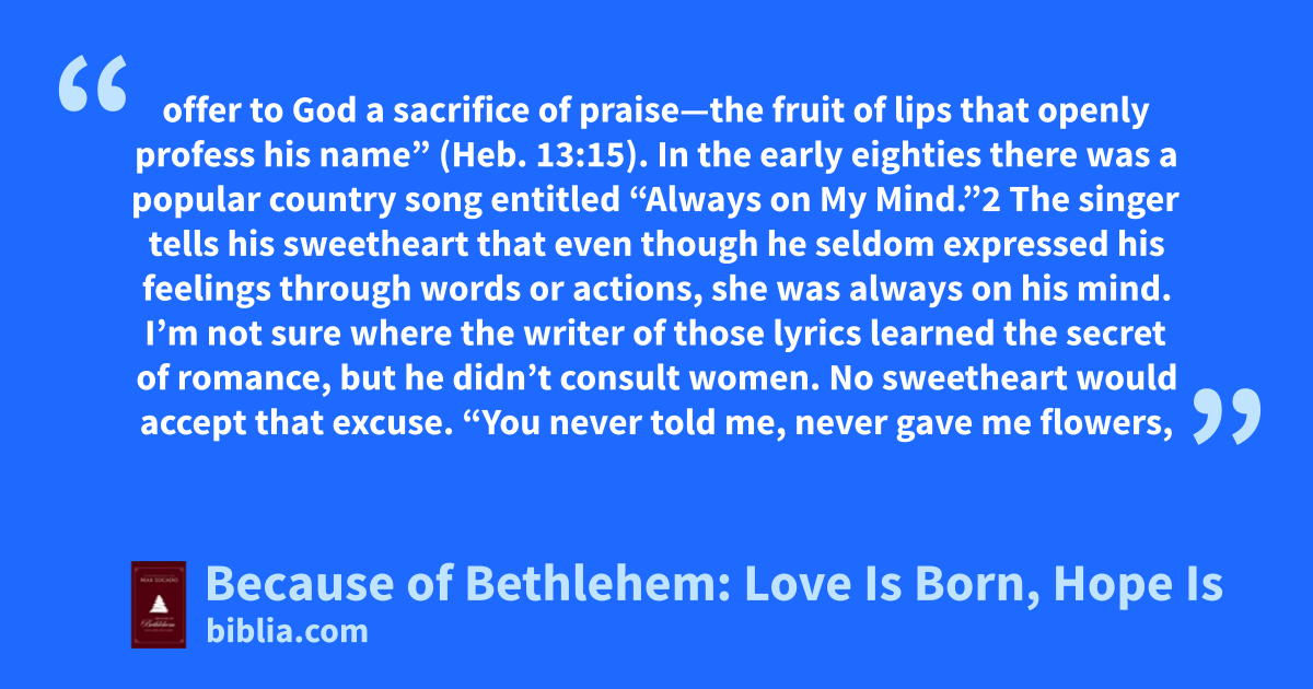 offer to God a sacrifice of praise—the fruit of lips that openly profess his name” (Heb. 13:15). In the early eighties there was a popular country song entitled “Always on My Mind.”2 The singer tells his sweetheart that even though he seldom expressed his feelings through words or actions, she was always on his mind. I’m not sure where the writer of those lyrics learned the secret of romance, but he didn’t consult women. No sweetheart would accept that excuse. “You never told me, never gave me flowers,