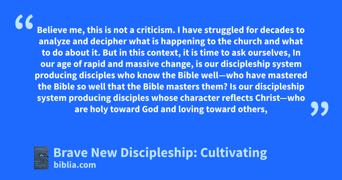 Believe me, this is not a criticism. I have struggled for decades to analyze and decipher what is happening to the church and what to do about it. But in this context, it is time to ask ourselves, In our age of rapid and massive change, is our discipleship system producing disciples who know the Bible well—who have mastered the Bible so well that the Bible masters them? Is our discipleship system producing disciples whose character reflects Christ—who are holy toward God and loving toward others,