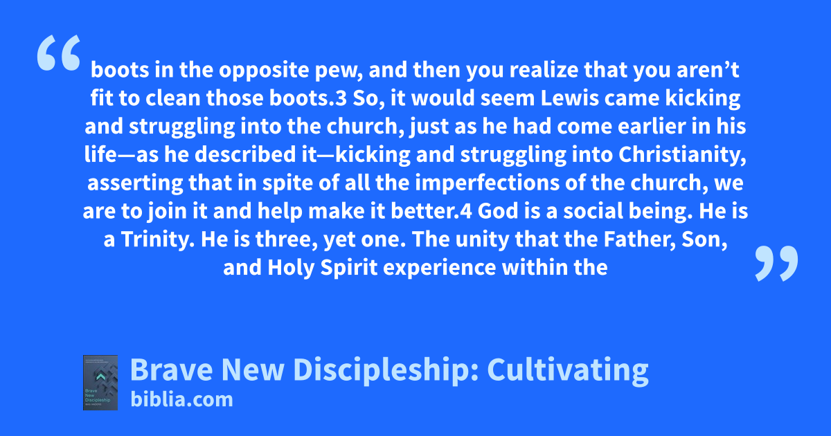 boots in the opposite pew, and then you realize that you aren’t fit to clean those boots.3 So, it would seem Lewis came kicking and struggling into the church, just as he had come earlier in his life—as he described it—kicking and struggling into Christianity, asserting that in spite of all the imperfections of the church, we are to join it and help make it better.4 God is a social being. He is a Trinity. He is three, yet one. The unity that the Father, Son, and Holy Spirit experience within the
