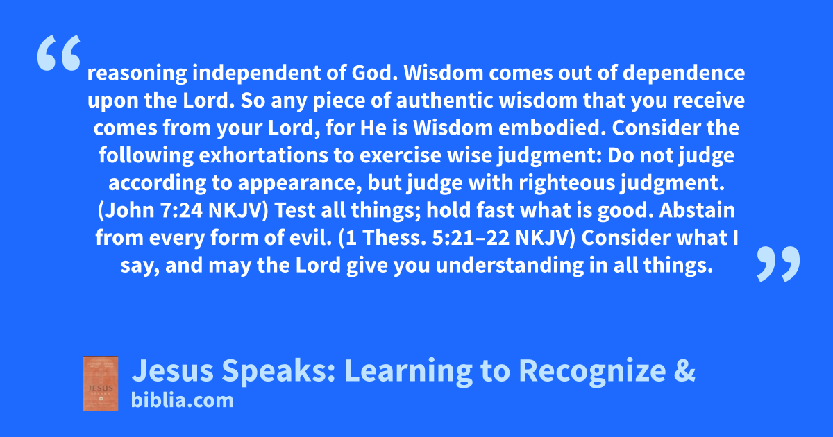 reasoning independent of God. Wisdom comes out of dependence upon the Lord. So any piece of authentic wisdom that you receive comes from your Lord, for He is Wisdom embodied. Consider the following exhortations to exercise wise judgment: Do not judge according to appearance, but judge with righteous judgment. (John 7:24 NKJV) Test all things; hold fast what is good. Abstain from every form of evil. (1 Thess. 5:21–22 NKJV) Consider what I say, and may the Lord give you understanding in all things.