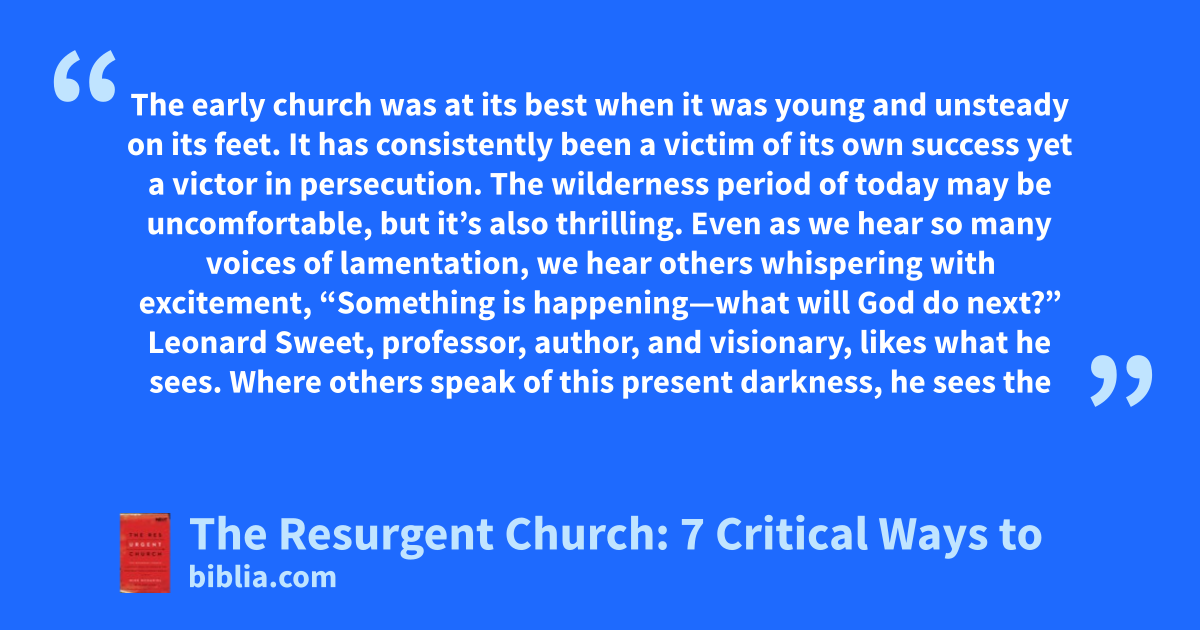 The early church was at its best when it was young and unsteady on its feet. It has consistently been a victim of its own success yet a victor in persecution. The wilderness period of today may be uncomfortable, but it’s also thrilling. Even as we hear so many voices of lamentation, we hear others whispering with excitement, “Something is happening—what will God do next?” Leonard Sweet, professor, author, and visionary, likes what he sees. Where others speak of this present darkness, he sees the