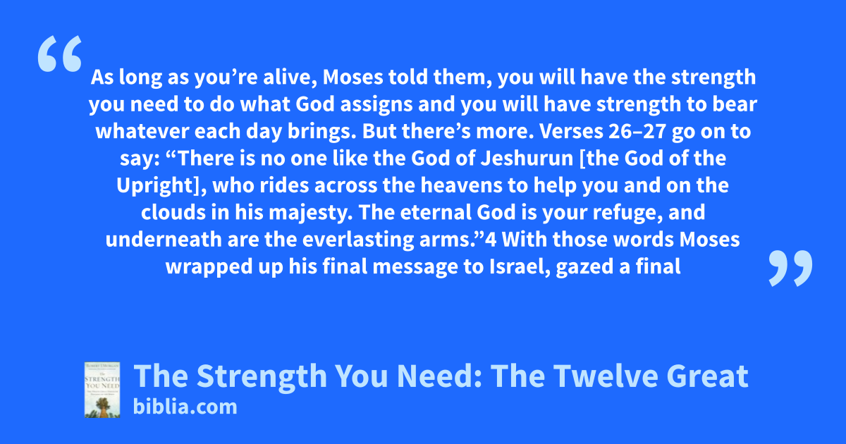 As long as you’re alive, Moses told them, you will have the strength you need to do what God assigns and you will have strength to bear whatever each day brings. But there’s more. Verses 26–27 go on to say: “There is no one like the God of Jeshurun [the God of the Upright], who rides across the heavens to help you and on the clouds in his majesty. The eternal God is your refuge, and underneath are the everlasting arms.”4 With those words Moses wrapped up his final message to Israel, gazed a final