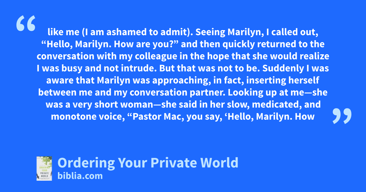 like me (I am ashamed to admit). Seeing Marilyn, I called out, “Hello, Marilyn. How are you?” and then quickly returned to the conversation with my colleague in the hope that she would realize I was busy and not intrude. But that was not to be. Suddenly I was aware that Marilyn was approaching, in fact, inserting herself between me and my conversation partner. Looking up at me—she was a very short woman—she said in her slow, medicated, and monotone voice, “Pastor Mac, you say, ‘Hello, Marilyn. How