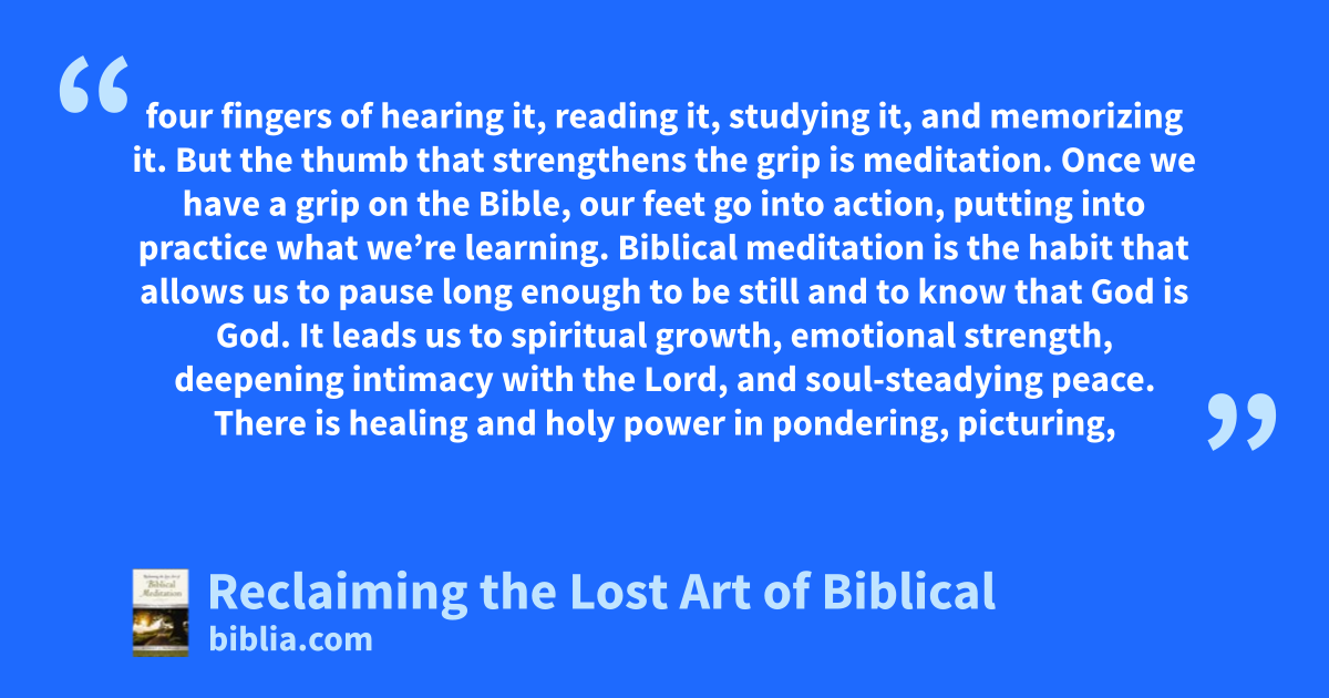 four fingers of hearing it, reading it, studying it, and memorizing it. But the thumb that strengthens the grip is meditation. Once we have a grip on the Bible, our feet go into action, putting into practice what we’re learning. Biblical meditation is the habit that allows us to pause long enough to be still and to know that God is God. It leads us to spiritual growth, emotional strength, deepening intimacy with the Lord, and soul-steadying peace. There is healing and holy power in pondering, picturing,