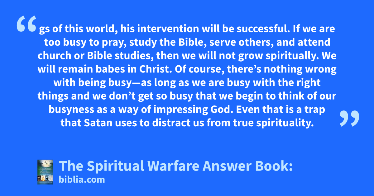 gs of this world, his intervention will be successful. If we are too busy to pray, study the Bible, serve others, and attend church or Bible studies, then we will not grow spiritually. We will remain babes in Christ. Of course, there’s nothing wrong with being busy—as long as we are busy with the right things and we don’t get so busy that we begin to think of our busyness as a way of impressing God. Even that is a trap that Satan uses to distract us from true spirituality.