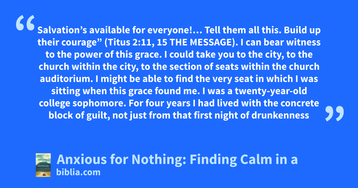 Salvation’s available for everyone!… Tell them all this. Build up their courage” (Titus 2:11, 15 THE MESSAGE). I can bear witness to the power of this grace. I could take you to the city, to the church within the city, to the section of seats within the church auditorium. I might be able to find the very seat in which I was sitting when this grace found me. I was a twenty-year-old college sophomore. For four years I had lived with the concrete block of guilt, not just from that first night of drunkenness