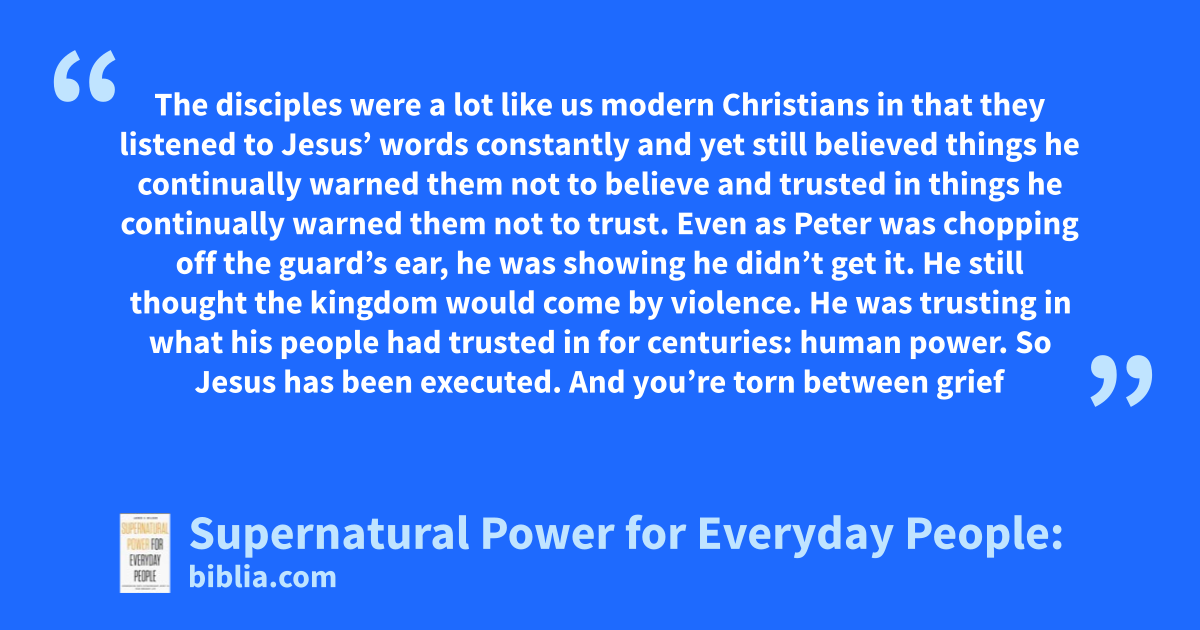The disciples were a lot like us modern Christians in that they listened to Jesus’ words constantly and yet still believed things he continually warned them not to believe and trusted in things he continually warned them not to trust. Even as Peter was chopping off the guard’s ear, he was showing he didn’t get it. He still thought the kingdom would come by violence. He was trusting in what his people had trusted in for centuries: human power. So Jesus has been executed. And you’re torn between grief